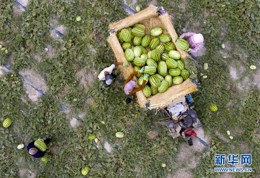 7月16日,在寧夏中衛(wèi)市香山鄉(xiāng)硒砂瓜萬畝示范基地,瓜農(nóng)將采收的西瓜裝車(無人機照片)。近日,寧夏中衛(wèi)市迎來硒砂瓜豐收季。硒砂瓜是中衛(wèi)市的特色農(nóng)產(chǎn)品,近年來,當?shù)夭扇〖夹g創(chuàng)新、規(guī)模化種植、休耕輪作等多項舉措,讓硒砂瓜種植成為當?shù)剞r(nóng)民增收致富的重要產(chǎn)業(yè)。據(jù)了解,今年中衛(wèi)市硒砂瓜種植面積為69.7萬畝。新華社記者楊植森攝