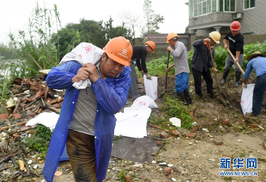 7月17日,防汛人員在秀洲區(qū)新塍鎮(zhèn)小金港村的河道邊加高堤防。浙江省嘉興市秀洲區(qū)處在杭嘉湖平原,受持續(xù)強(qiáng)降雨及上游排水影響,近期,秀洲區(qū)境內(nèi)的京杭大運(yùn)河分支航道持續(xù)保持較高水位。當(dāng)?shù)叵嚓P(guān)部門(mén)嚴(yán)陣以待,落實(shí)各項(xiàng)措施,確保安全度汛。新華社記者韓傳號(hào)攝