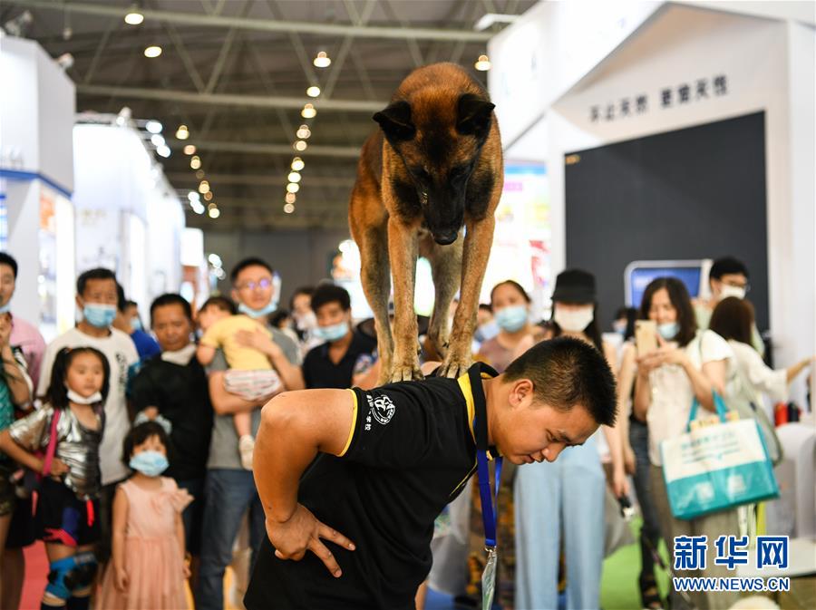 7月19日,在成都世紀城新國際會展中心,一家寵物學校的馴導師在表演馴犬。當日,第九屆成都國際寵博會進入最后一天。此次展會展出面積30000平方米,匯聚國內外品牌企業(yè)和產(chǎn)品,覆蓋中西部地區(qū)寵物行業(yè)食品、用品、醫(yī)療和服務等領域。新華社記者王曦攝