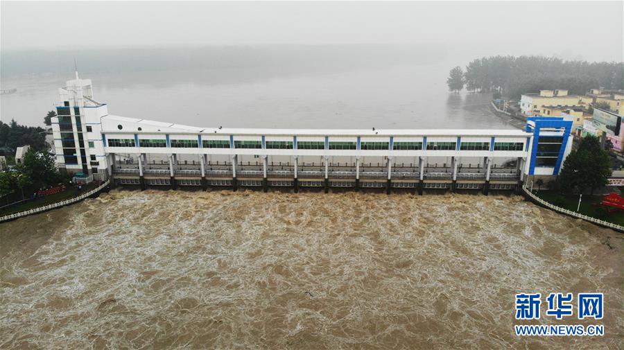 7月20日,洪水通過王家壩閘涌入蒙洼蓄洪區(qū)(無人機(jī)照片)。當(dāng)日8時(shí)32分,淮河干流王家壩閘開閘泄洪。受近期強(qiáng)降雨影響,淮河干流王家壩站水位19日快速上漲,7月20日6時(shí)36分水位漲至29.66米,超過保證水位0.36米?;春油跫覊伍l開閘泄洪,蒙洼蓄洪區(qū)啟用。新華社記者黃博涵攝