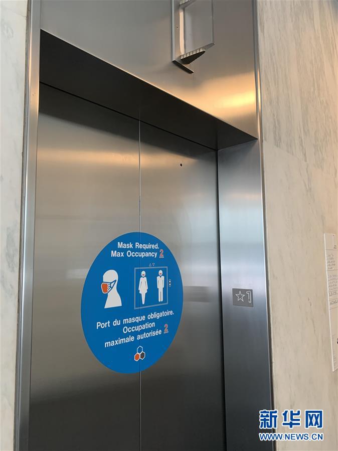 7月20日,在位于紐約的聯(lián)合國總部,電梯門上張貼著要求人們在公共場所佩戴口罩等標(biāo)識。受新冠疫情影響而實(shí)行遠(yuǎn)程辦公4個(gè)多月的紐約聯(lián)合國總部20日進(jìn)入重啟第一階段。按規(guī)定,該階段每天進(jìn)入總部大樓人數(shù)不能超過400人。新華社記者王建剛攝