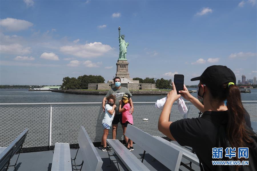 7月20日,參觀者在美國紐約前往自由島的游艇上拍照留念。美國紐約市20日繼續(xù)推進經(jīng)濟重啟計劃,宣布開始進入解封新階段,進一步允許部分低風(fēng)險文娛活動重啟。自由女神像所在的自由島對公眾開放,但雕像內(nèi)部和博物館仍關(guān)閉。新華社記者王迎攝