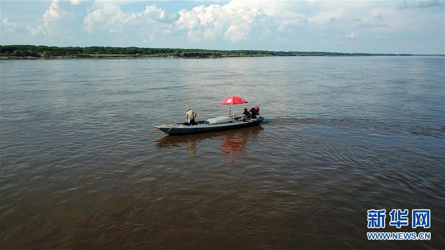 7月22日,在二道江灘地,赫哲族村民劉洪海的妻子叢秀松把剛打上來的魚放進(jìn)船艙。新華社記者王建威攝