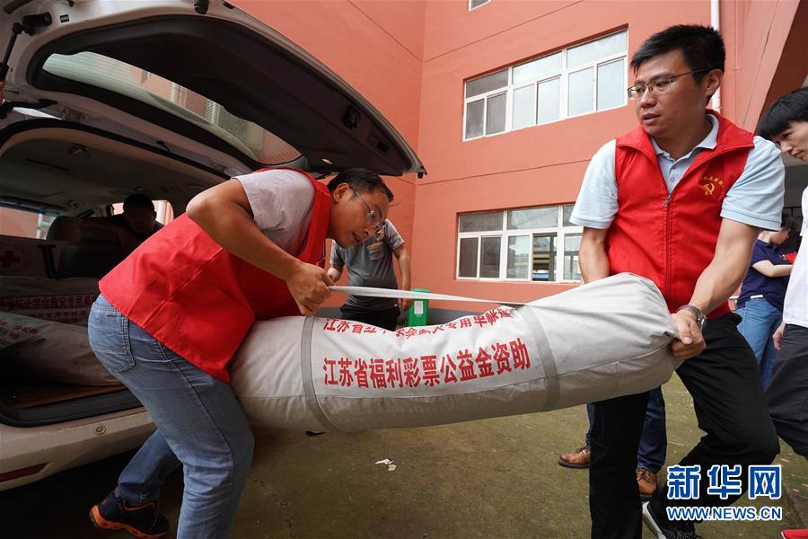 7月23日,工作人員在盱眙縣鮑集小學(xué)安置點搬運帳篷。當(dāng)日,受淮河盱眙段水位上漲影響,江蘇省淮安市盱眙縣啟動鮑集圩行洪區(qū)萬余名群眾撤離轉(zhuǎn)移工作,確保安全度汛。新華社記者韓瑜慶攝