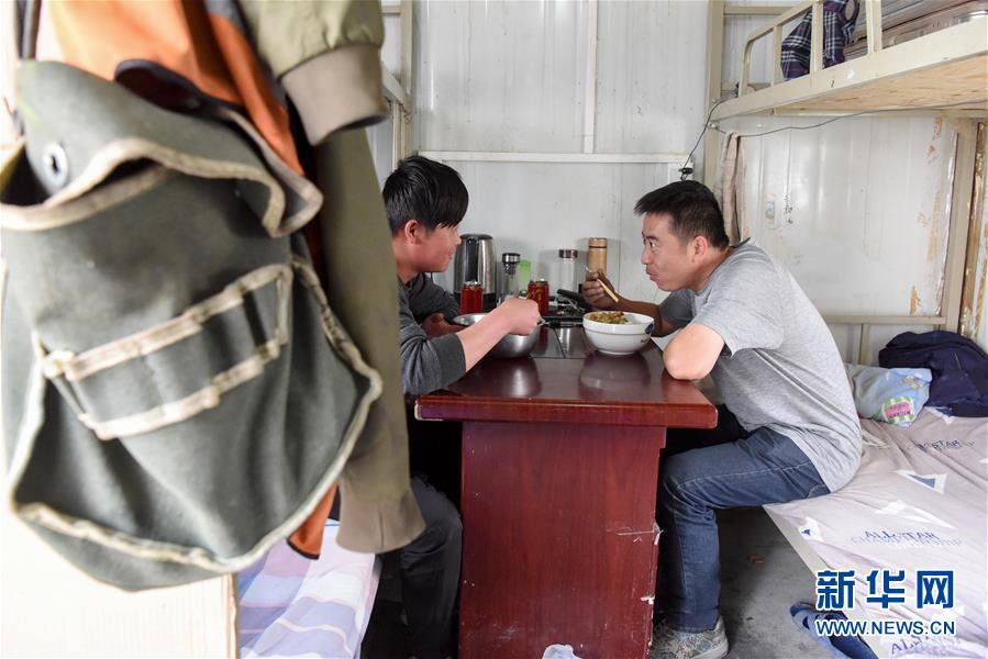 在索爾庫(kù)里宿營(yíng)地,中鐵一局的施工人員在“白皮列車”內(nèi)吃午飯(7月19日攝)。新華社記者 丁磊 攝