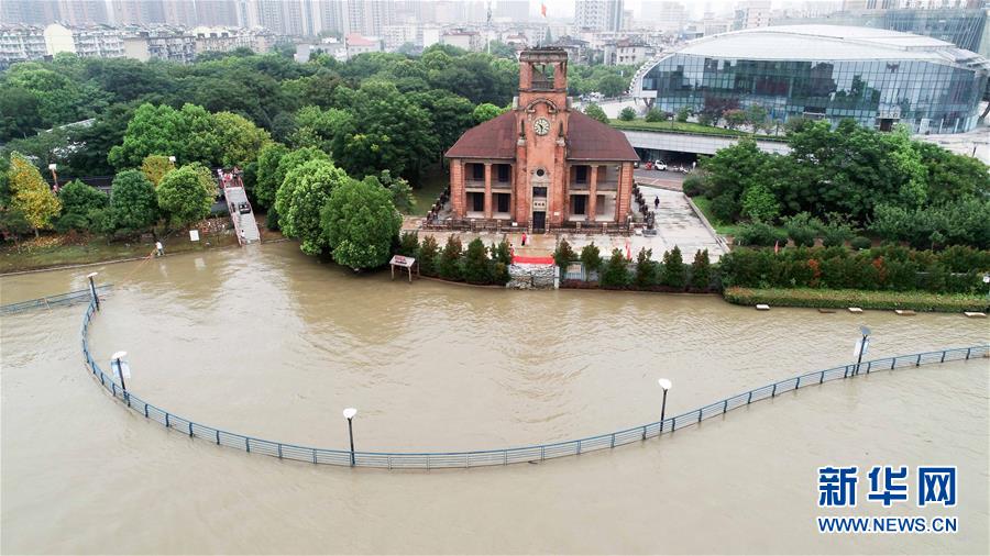 蕪湖市標(biāo)志性建筑之一老海關(guān)前的觀景平臺(tái)已被江水淹沒(méi)(7月25日攝,無(wú)人機(jī)照片)。新華社記者 曹力 攝