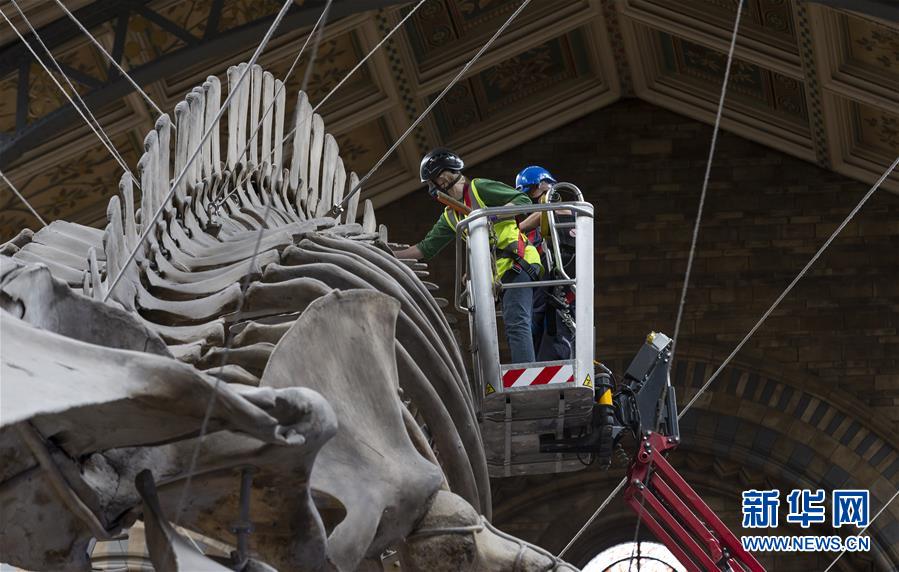7月27日,工作人員在英國倫敦的自然歷史博物館大廳內(nèi)清潔一具藍(lán)鯨骨架。受新冠疫情影響關(guān)閉數(shù)月的英國自然歷史博物館將于8月5日重新對(duì)外開放,目前館方正在為重新開放做最后準(zhǔn)備。參觀者需要提前預(yù)約參觀時(shí)段、全程佩戴口罩且保持安全距離。新華社記者韓巖攝