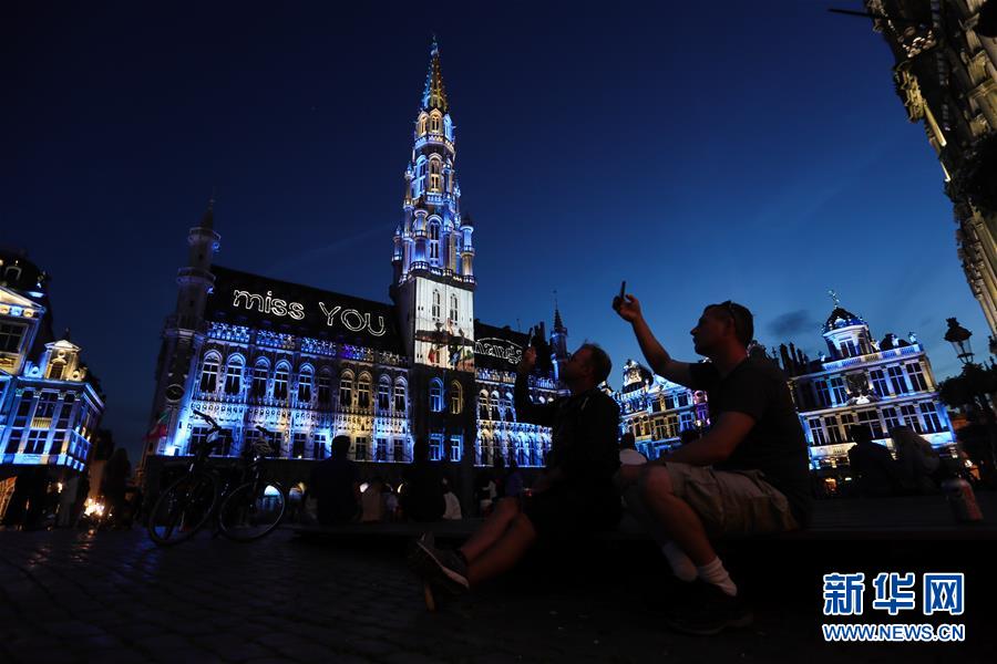 7月29日,人們?cè)诒壤麜r(shí)布魯塞爾大廣場欣賞聲光秀,市政廳外墻上投射出“想念你,音樂”的字樣。7月29日,比利時(shí)布魯塞爾大廣場舉行大型聲光秀。藝術(shù)家在市政廳等歷史建筑上投影文字和圖案,紀(jì)念這個(gè)夏天受新冠疫情影響而不能如期舉辦的文化活動(dòng)。新華社記者鄭煥松攝