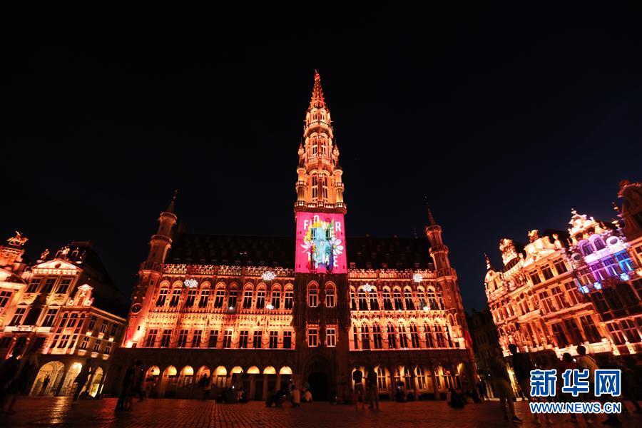 7月29日,人們?cè)诒壤麜r(shí)布魯塞爾大廣場欣賞聲光秀,市政廳外墻上投射出鮮花地毯主題的圖案。7月29日,比利時(shí)布魯塞爾大廣場舉行大型聲光秀。藝術(shù)家在市政廳等歷史建筑上投影文字和圖案,紀(jì)念這個(gè)夏天受新冠疫情影響而不能如期舉辦的文化活動(dòng)。新華社記者鄭煥松攝