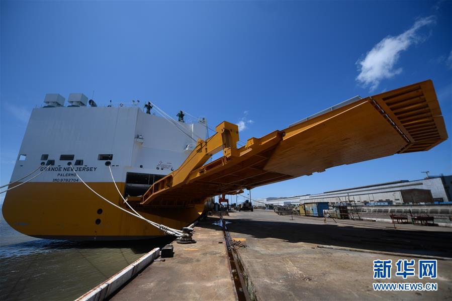 8月1日在位于螞蟻島的揚帆集團東海岸造船廠拍攝的一艘在建的汽車滾裝船,月底即將交付給意大利客戶。新華社記者黃宗治攝
