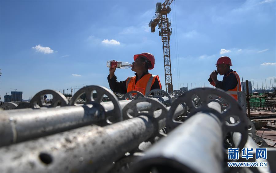 8月3日,工人在長江文創(chuàng)產(chǎn)業(yè)園項目工地休息喝水。進入8月,武漢迎來持續(xù)高溫天氣。在湖北廣電傳媒基地工程的工地上,中建三局總承包公司1500多名工人持續(xù)奮戰(zhàn),力保工程進度。該工程是我國中部地區(qū)首個國家級廣播影視媒體基地,由湖北廣電傳媒大廈項目、長江文創(chuàng)產(chǎn)業(yè)園項目、廣電生活配套項目三大板塊組成,總建設(shè)規(guī)模130萬平方米。自今年3月25日獲批正式復(fù)工以來,承建方克服困難,把因疫情影響耽誤的工期趕了回來,預(yù)計將按原計劃完成建設(shè)任務(wù)。新華社記者程敏攝