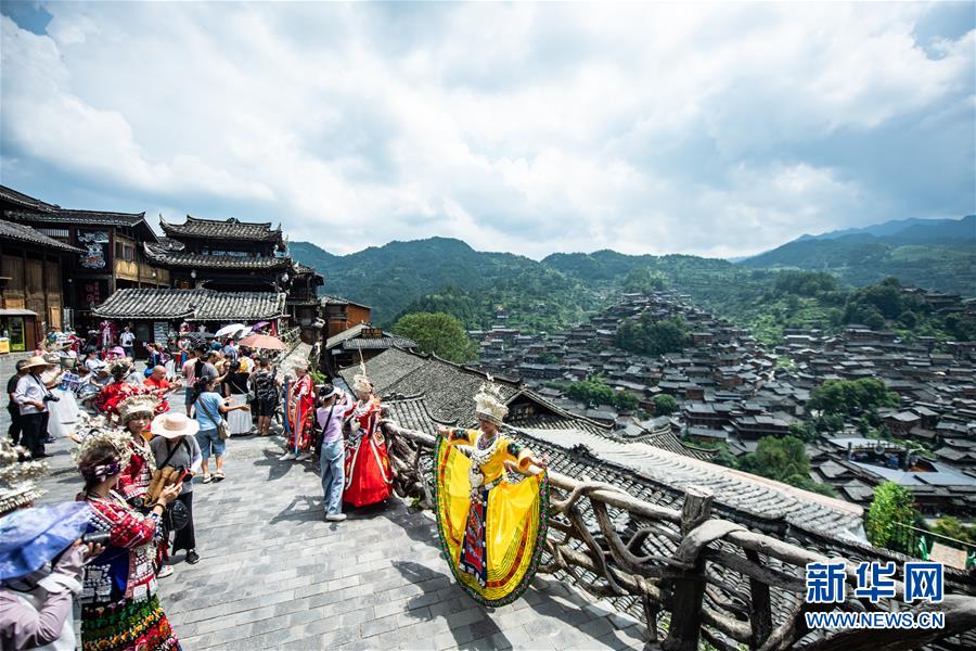 游客在貴州省雷山縣西江千戶苗寨景區(qū)內(nèi)拍照留念(7月31日攝)。新華社記者陶亮攝
