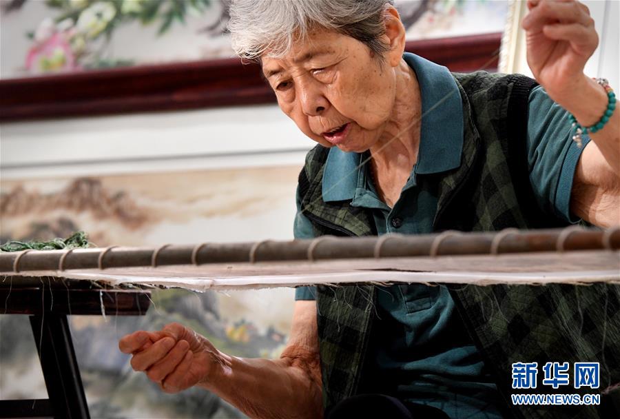 在開封市素花宋繡工藝有限公司的展示館里,王素花在刺繡(7月30日攝)。