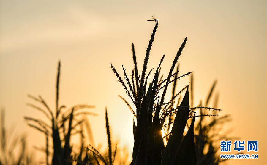 在吉林省梨樹縣國(guó)家百萬(wàn)畝綠色食品原料(玉米)標(biāo)準(zhǔn)化生產(chǎn)基地核心示范區(qū),一只蜻蜓??吭谝恢暧衩咨希?月23日攝)。新華社記者許暢攝