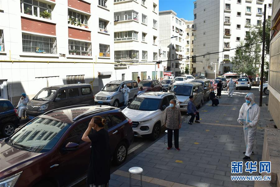 8月5日,居民在烏魯木齊市天山區(qū)山西巷社區(qū)排隊(duì)等待核酸檢測。新華社記者高晗攝