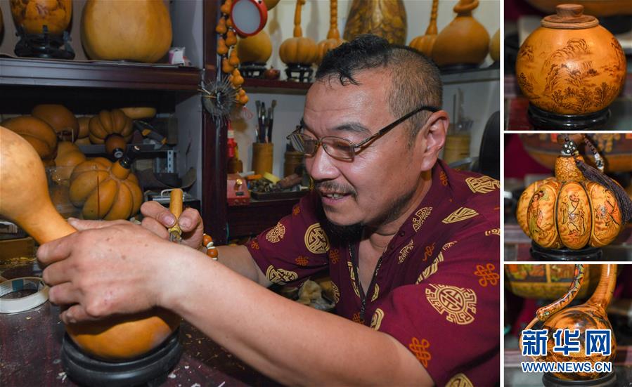 8月5日,侯景偉在葫蘆上進行創(chuàng)作。今年55歲的吉林四平人侯景偉自幼與家人學習雕刻、烙畫藝術。經(jīng)過多年潛心研究,他將浮雕和烙畫工藝相結(jié)合,通過拋光、起稿、雕刻、烙燙、套色等十余道工藝,制作展現(xiàn)傳統(tǒng)文化、民俗故事的葫蘆工藝品。2020年,侯景偉被評為四平市非物質(zhì)文化遺產(chǎn)項目侯氏葫蘆雕刻烙畫代表性傳承人。他說:“希望有更多人加入到非遺傳承隊伍中,讓小葫蘆‘講’出更多民俗故事。”新華社記者張楠攝