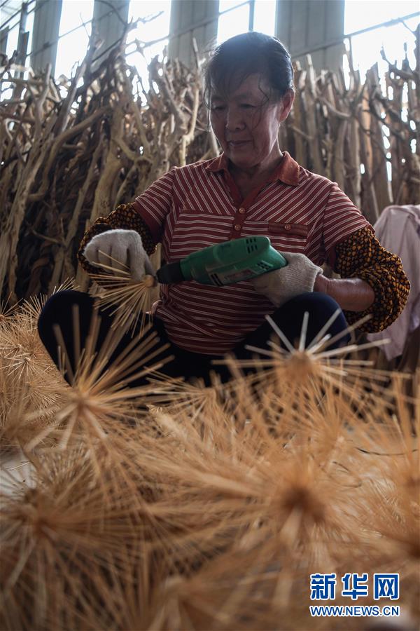 8月7日,工人利用柑橘樹枝加工吊燈飾品。2017年以來,廣西桂林市永福縣永安鄉(xiāng)通過幫扶返鄉(xiāng)青年創(chuàng)業(yè)的方式,建立起根雕工藝品就業(yè)扶貧車間,組織貧困群眾進(jìn)車間務(wù)工學(xué)藝,把當(dāng)?shù)刎S富的朽木和柑橘樹根枝資源利用起來,加工成盆景、茶桌、吊燈等根雕工藝品,不僅幫助貧困群眾在家門口掌握一技之長(zhǎng),還讓他們?cè)诿撠氄焙髮?shí)現(xiàn)穩(wěn)定增收。新華社記者張愛林?jǐn)z
