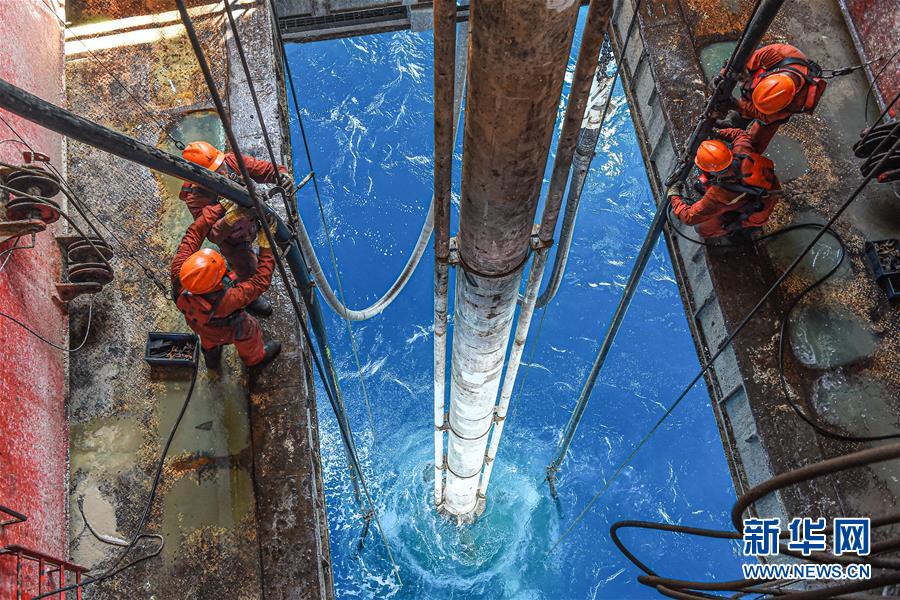 7月26日,在位于南海北部海域的勘探三號鉆井平臺上,鉆井工人在擺放鉆桿。新華社記者蒲曉旭攝