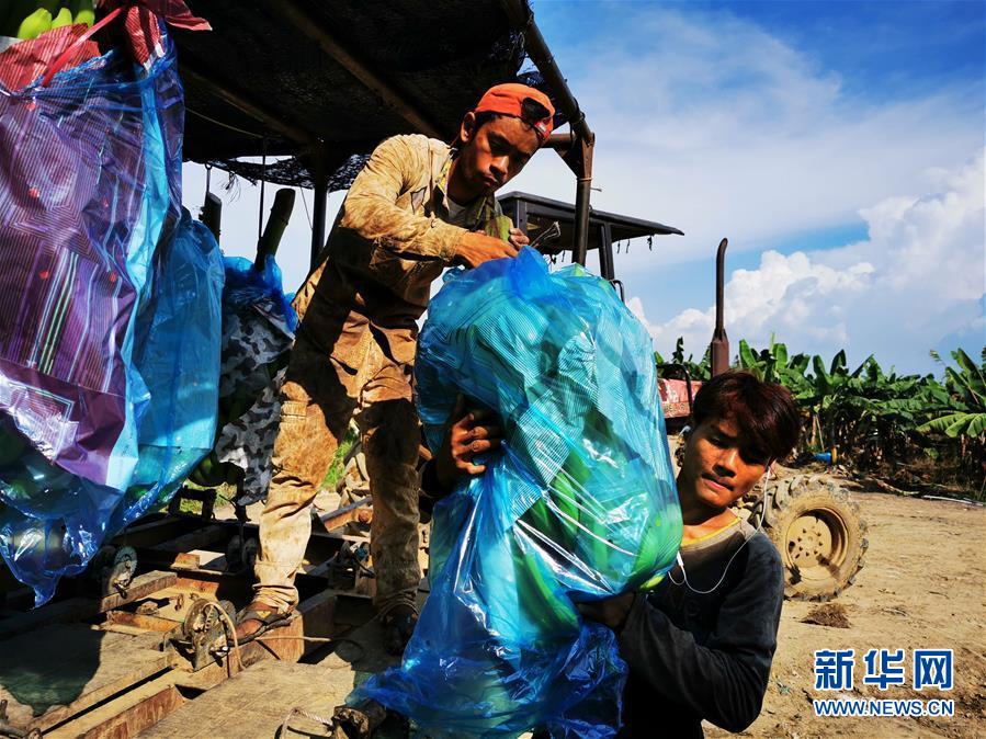 7月16日,在柬埔寨桔井省的柬埔寨—中國熱帶生態(tài)農(nóng)業(yè)合作示范區(qū)內(nèi),工人搬運(yùn)剛剛收獲的香蕉(手機(jī)拍攝)。新華社記者毛鵬飛攝。