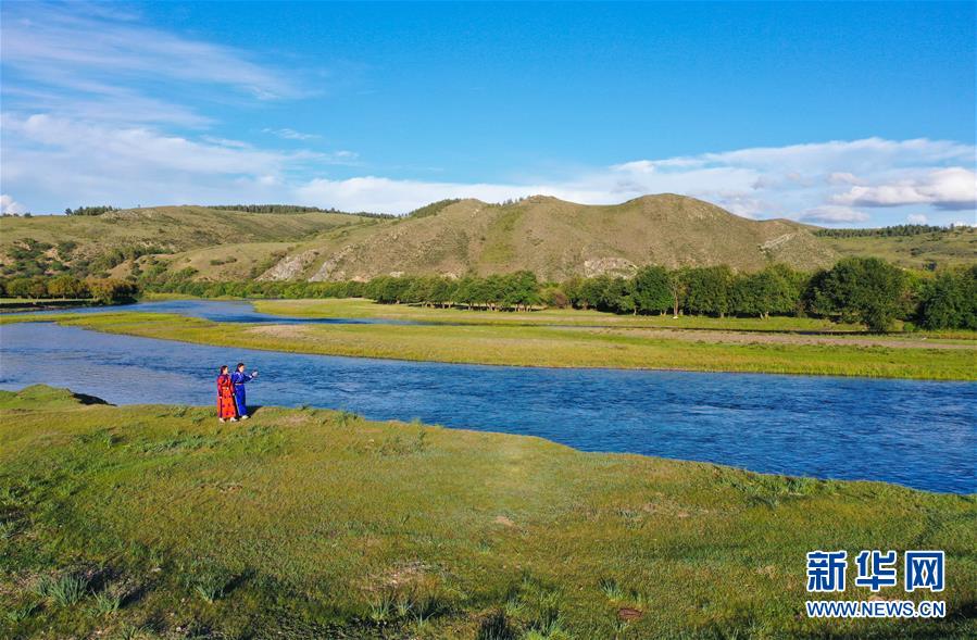 在內(nèi)蒙古自治區(qū)鄂溫克族自治旗伊敏蘇木,艾吉瑪(左)和母親烏仁在伊敏河邊散步(8月6日攝,無(wú)人機(jī)照片)。新華社記者徐欽攝。