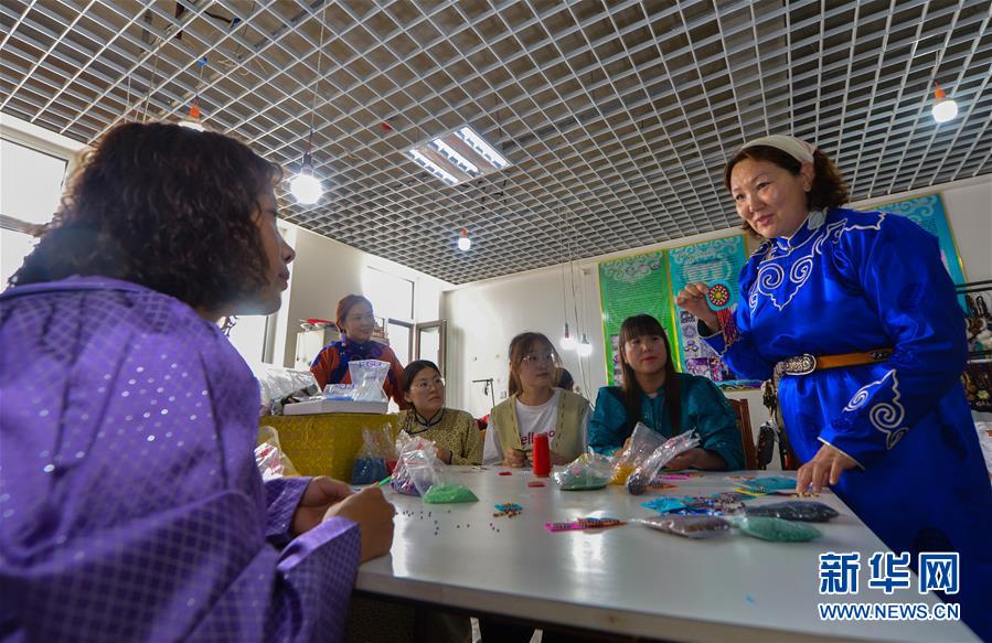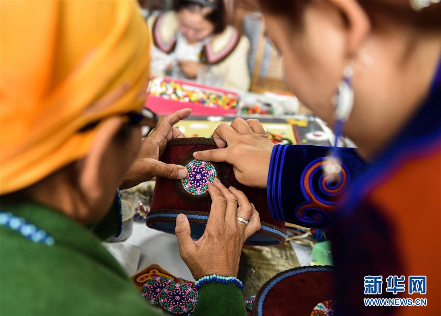 在內(nèi)蒙古自治區(qū)鄂溫克族自治旗巴彥托海鎮(zhèn)太陽(yáng)花傳承發(fā)展中心,脫貧戶敖登圖雅(左)向?yàn)跞式桓蹲约褐谱骱玫氖止に嚻罚?月6日攝)。新華社記者徐欽攝。