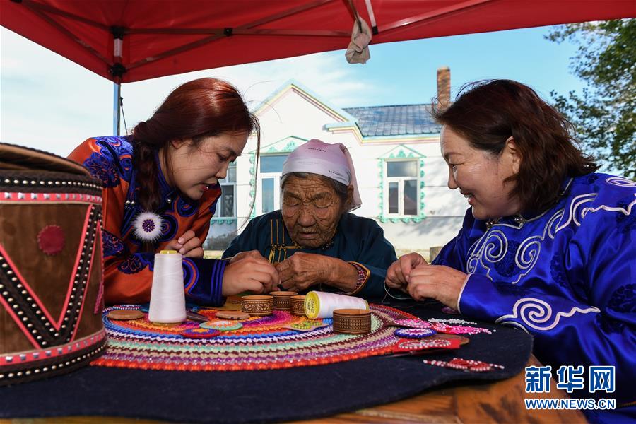 在內(nèi)蒙古自治區(qū)鄂溫克族自治旗伊敏蘇木的老家,艾吉瑪(左)在向姥姥水機(jī)花(中)、母親烏仁(右)學(xué)習(xí)太陽(yáng)花制作工藝。(8月6日攝)。新華社記者劉磊攝。