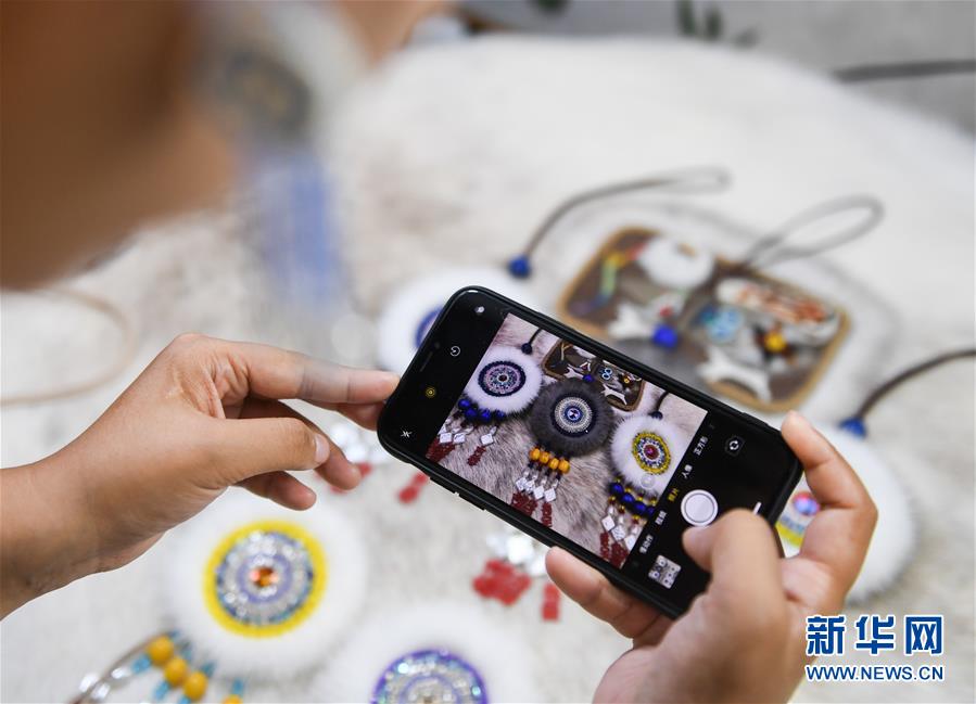 在內(nèi)蒙古自治區(qū)鄂溫克族自治旗巴彥托海鎮(zhèn)太陽(yáng)花傳承發(fā)展中心,艾吉瑪在拍攝手工藝品照片(8月7日攝)。新華社記者劉磊攝。