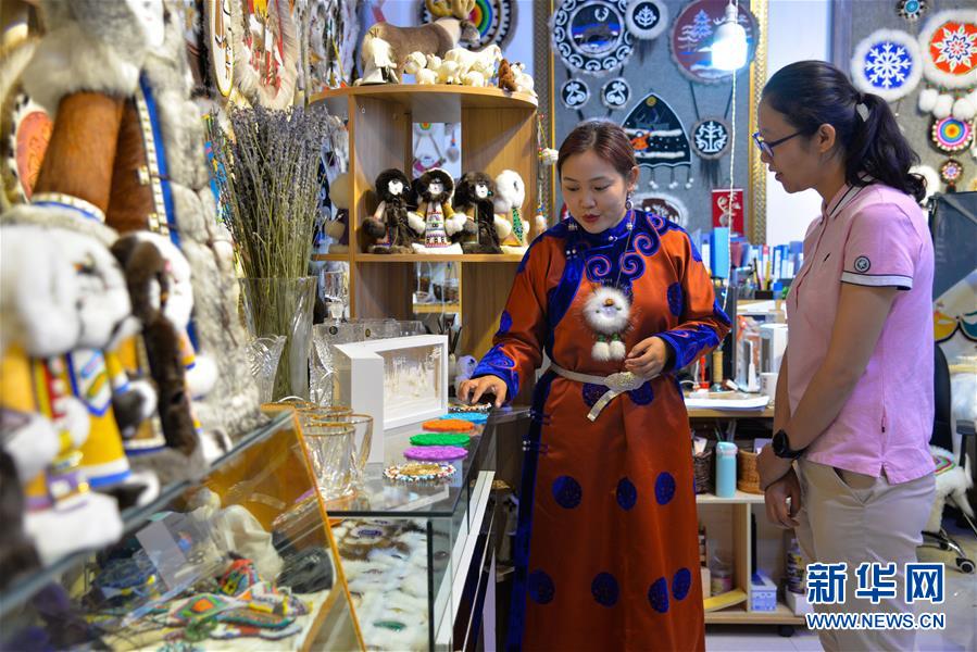 艾吉瑪(左)在內(nèi)蒙古自治區(qū)鄂溫克族自治旗巴彥托海鎮(zhèn)太陽(yáng)花傳承發(fā)展中心向顧客介紹手工藝品(8月6日攝)。新華社記者徐欽攝。