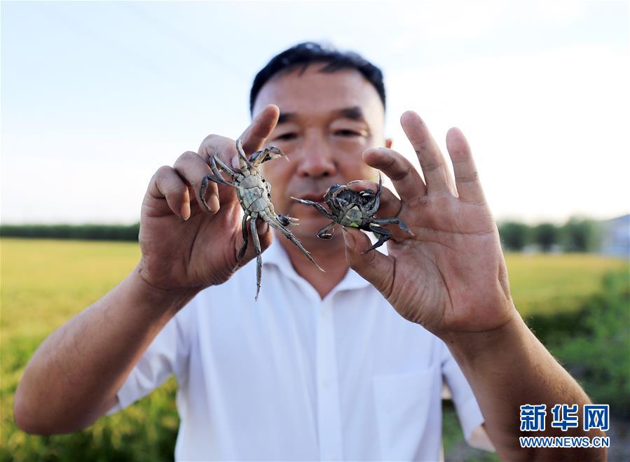 8月12日,春華村黨支部書記董為春展示從水稻田中捕撈的稻田蟹。新華社記者 雒圓 攝