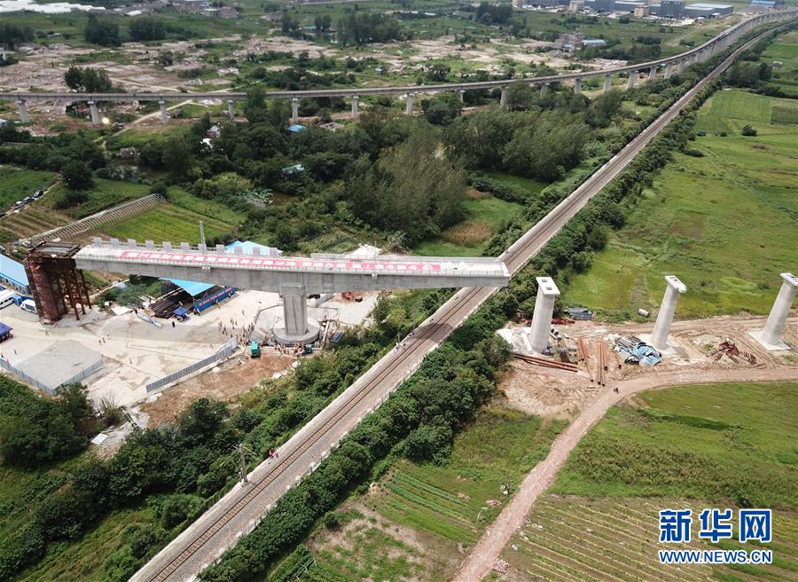 這是8月12日拍攝的水蚌鐵路蚌埠段改線(xiàn)工程?hào)|站疏解線(xiàn)特大橋跨越京滬鐵路上行線(xiàn)轉(zhuǎn)體梁轉(zhuǎn)體施工現(xiàn)場(chǎng)(無(wú)人機(jī)照片)。新華社記者 劉軍喜 攝