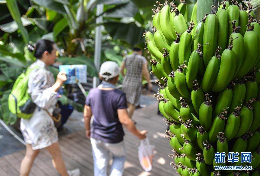 在吉林省永吉縣萬(wàn)昌鎮(zhèn)宇豐紅果木瓜產(chǎn)業(yè)園,游客與大棚內(nèi)的香蕉合影留念(8月12日攝)。新華社記者 許暢 攝