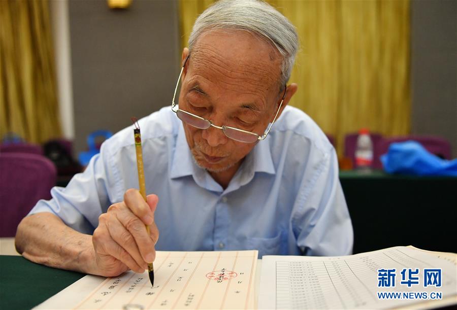 8月13日,陜西師范大學退休教師符有堂書寫錄取通知書。當日,陜西師范大學2020年手寫錄取通知書正式開筆。該校自2007年起采用毛筆書寫錄取通知書的方式,為新生傳遞佳音。今年,學校十余位退休教師、在職教師、校友代表等書法愛好者將為約4500名新錄取的本科生送上帶著墨香的大學錄取通知書。新華社記者張博文攝