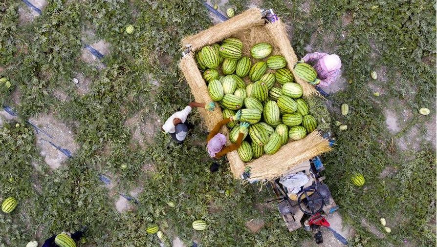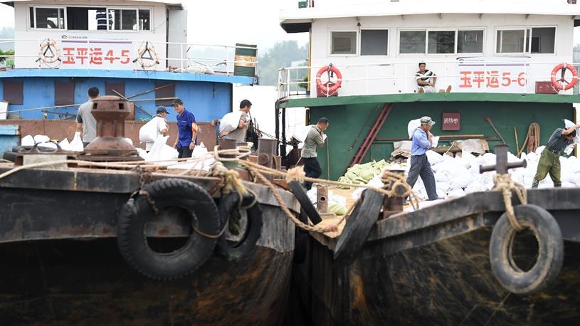 7月14日,當地村民往船只上搬運砂石袋。當地防汛部門組織船只裝載砂石袋等防汛物資,運往圩堤保防汛。