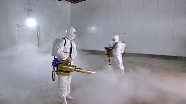 7月14日,北京二商肉類食品集團有限公司員工在對肉類運輸車輛??繀^(qū)域進行防疫消毒。