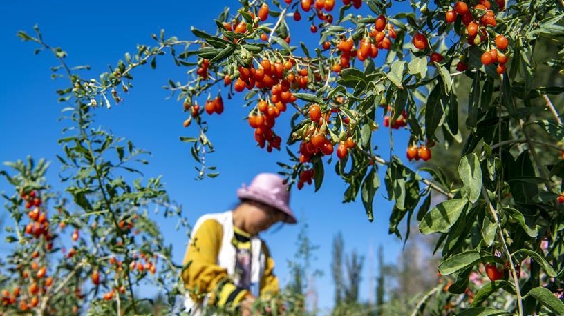 7月13日,在新疆精河縣托里鎮(zhèn)的一處枸杞種植園,村民在采收枸杞。