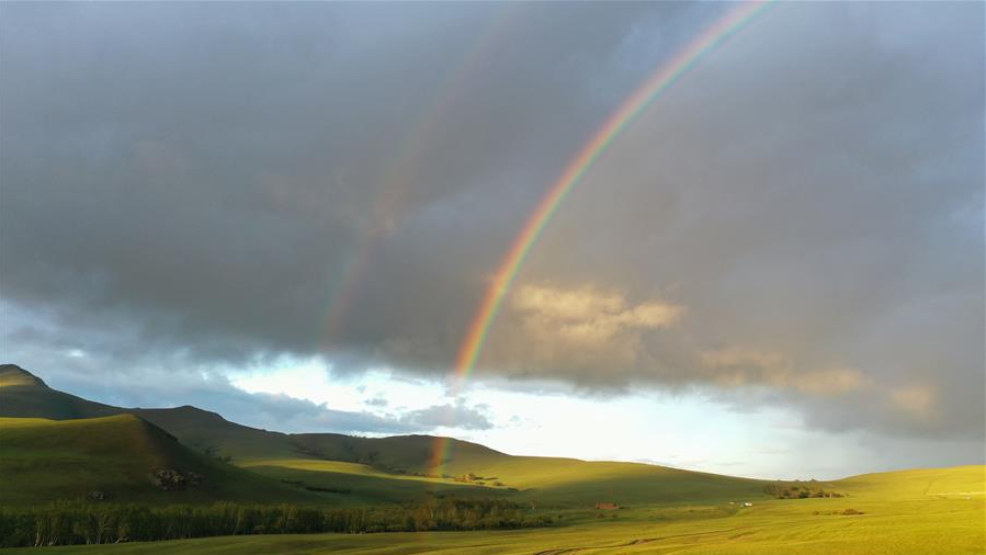 這是6月3日拍攝的阿魯科爾沁草原上的彩虹(無(wú)人機(jī)照片)。