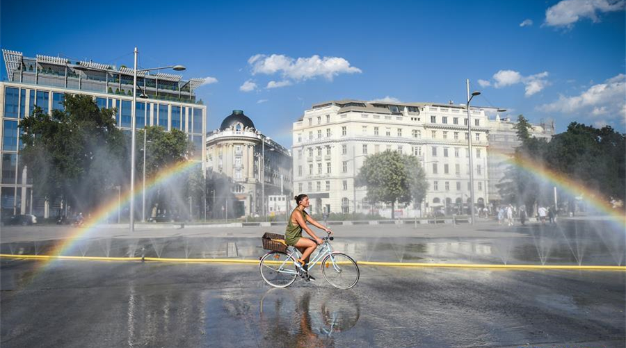 7月28日,在奧地利維也納,一名女子騎車經(jīng)過一處廣場的噴水設(shè)施。當(dāng)日,維也納市中心的最高氣溫達到37.2攝氏度,不少市民戲水消暑。