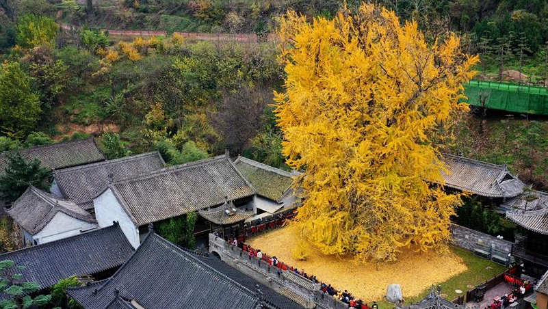 初冬時節(jié),陜西省西安市長安區(qū)羅漢洞村終南山古觀音禪寺內的千年銀杏樹滿目金黃,落葉宛如金毯,吸引游客前來參觀游覽。