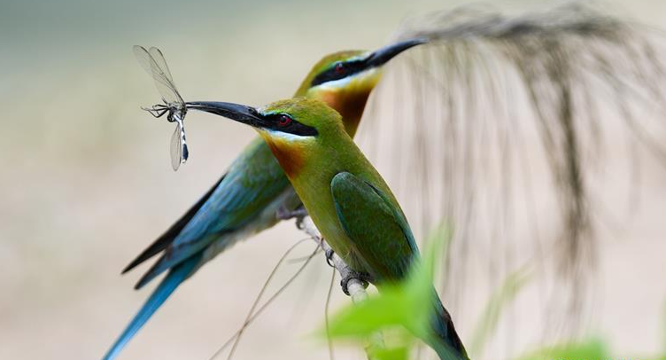 近日,不少栗喉蜂虎來(lái)到海南省??谑兄卜敝?,據(jù)??诋z榃濕地研究所工作人員統(tǒng)計(jì),目前來(lái)到??诘睦鹾矸浠⒁延薪?00只。