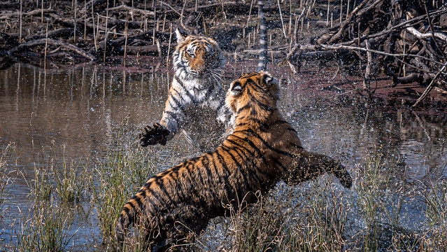 正在享受竹子大餐的廣州長(zhǎng)隆野生動(dòng)物世界大熊貓婷仔被大熊貓隆仔搶食,兩只大熊貓上演一場(chǎng)爭(zhēng)食戲碼。