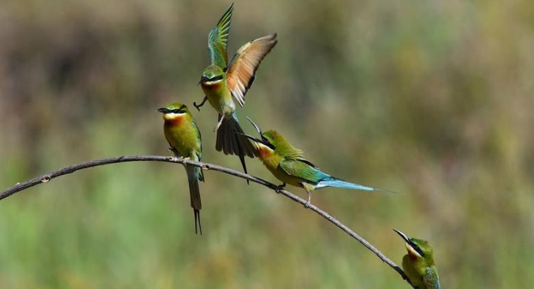 近日,百余只栗喉蜂虎和少量藍(lán)喉蜂虎來到海南省??谑形骱0抖鄠€地點(diǎn)棲息繁衍,為椰城增添一抹亮色。