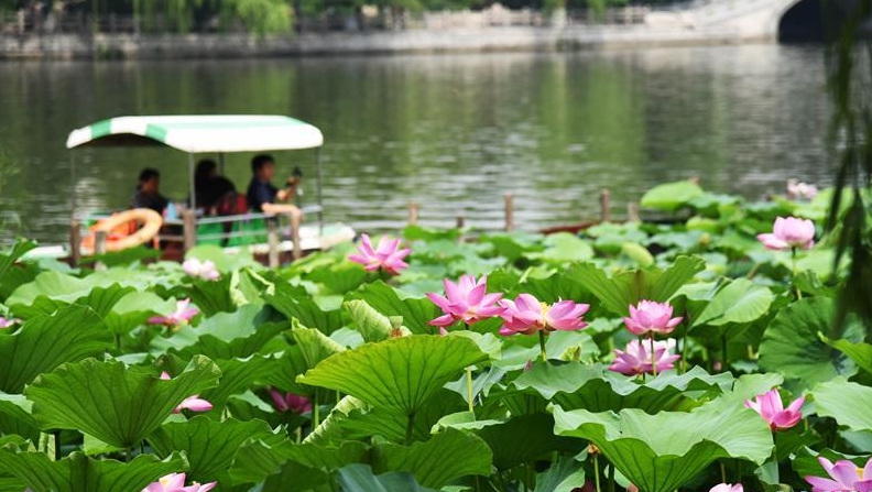 近日,山東濟(jì)南大明湖的荷花陸續(xù)綻放,吸引游客前來(lái)觀賞。