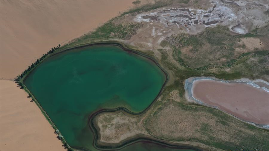 內(nèi)蒙古自治區(qū)巴丹吉林沙漠腹地分布著形狀各異的湖泊。湖泊點綴黃沙之中,成為別致的風(fēng)景。