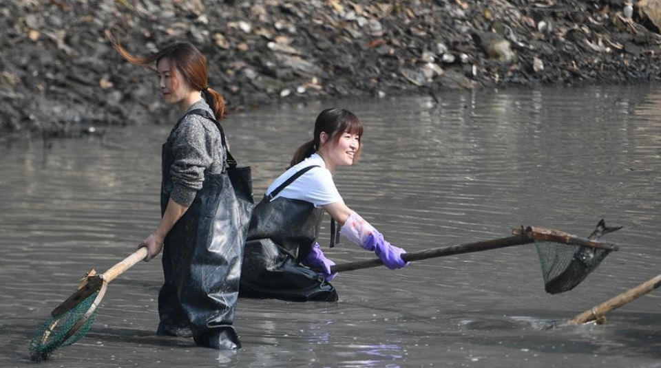 近日在杭州西溪國家濕地公園,漁夫們抽掉塘水清理淤泥,一批游客借用漁夫們的下水褲,體驗(yàn)“干塘”捕魚。