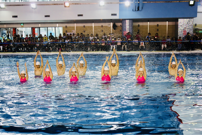 活動(dòng)伊始,來(lái)自廣州體育學(xué)院的水中健身操教練團(tuán)隊(duì)為大家?guī)?lái)了精彩的水中集體徒手操、水中集體太極、水中集體恰恰、水中集體健身棒操、水中集體深水操表演。接下來(lái)的體驗(yàn)時(shí)間,身著泳衣的學(xué)員們?cè)趯I(yè)教練的指導(dǎo)下進(jìn)行熱身活動(dòng)。十分鐘左右的熱身活動(dòng)結(jié)束后,學(xué)員們走下泳池踩著音樂(lè)的節(jié)拍于水中體驗(yàn)水中游戲、健身徒手操、手中太極等課程,學(xué)員們?cè)诮叹毜膸?dòng)下,熱情的學(xué)習(xí)跑、跳、拉伸等動(dòng)作,利用水的阻力、浮力和傳熱性進(jìn)行全身耗氧運(yùn)動(dòng)。