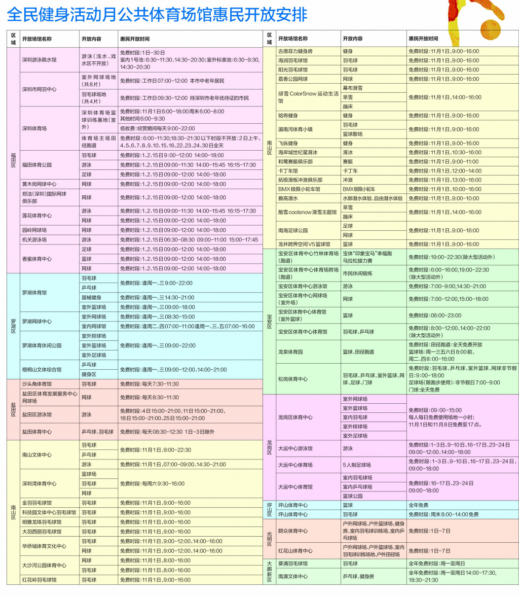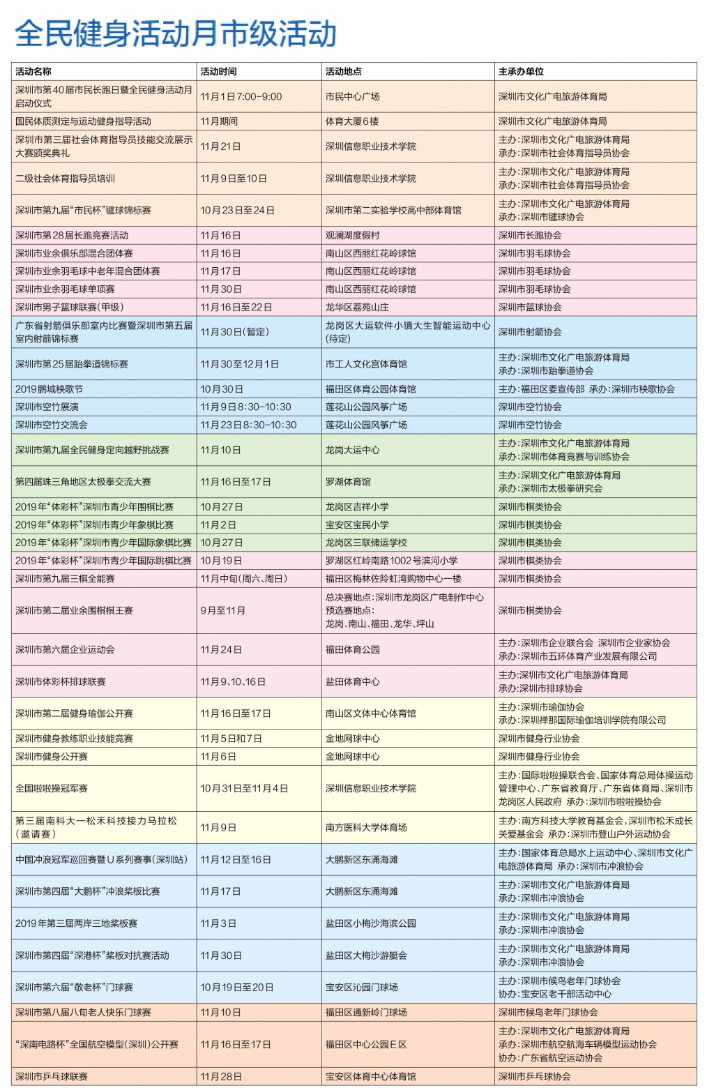 11月期間,深圳將舉辦37場(chǎng)市級(jí)活動(dòng),內(nèi)容包括跑步、籃球、羽毛球、射箭、跆拳道、秧歌、定向越野賽、太極拳、排球、棋類等比賽以及國(guó)民體測(cè)與健身指導(dǎo)等系列活動(dòng)。同時(shí),全市各區(qū)、各單位也因地制宜地將舉辦百余場(chǎng)方便市民參與的全民健身活動(dòng),涵蓋項(xiàng)目豐富多彩,最大限度地滿足市民群眾的健身需求。