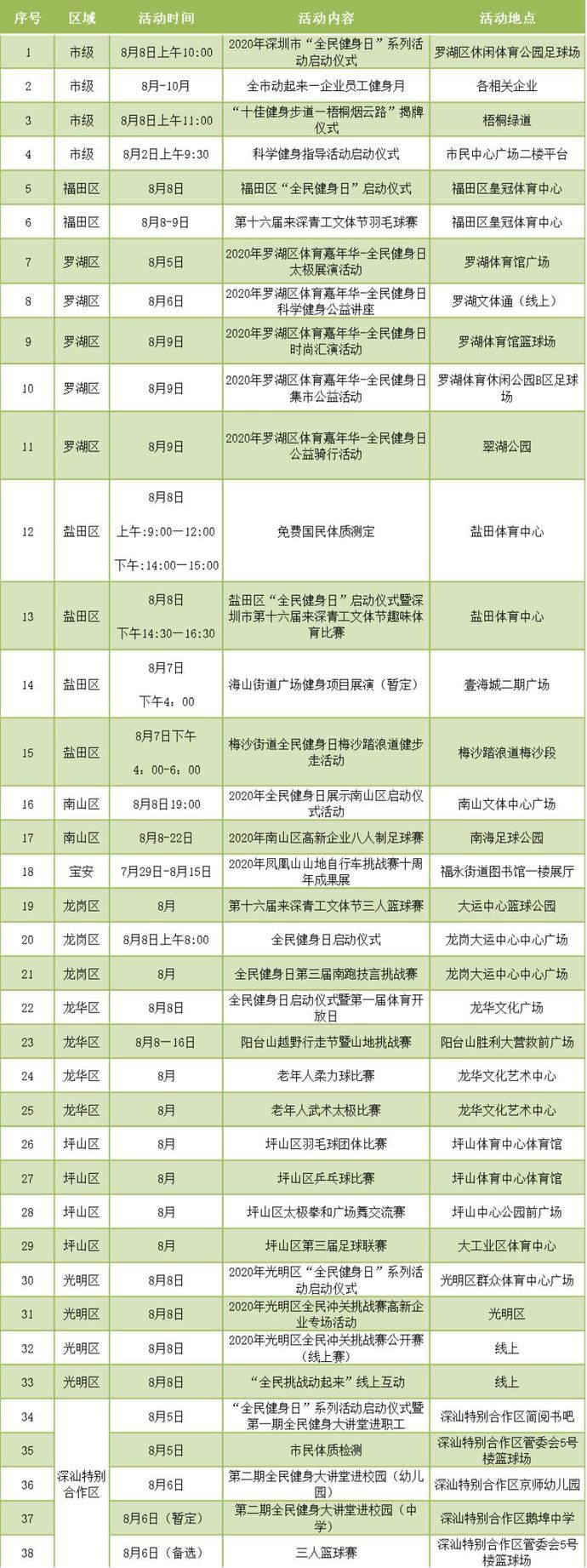 在啟動(dòng)當(dāng)日,全市各區(qū)也同步聯(lián)動(dòng),啟動(dòng)了“全民健身日”系列活動(dòng)。即日起至8月10日,深圳將陸續(xù)推出近40項(xiàng)全民健身運(yùn)動(dòng)系列活動(dòng),內(nèi)容涵蓋來(lái)深青工文體節(jié)、企業(yè)員工健身月、體育嘉年華系列展演、全民沖關(guān)線上挑戰(zhàn)賽、足球、籃球、老年太極、柔力球、國(guó)民體質(zhì)測(cè)定、全民健身大講堂、健身步道健步行等。此外,全市各公益體育館也將面向市民免費(fèi)開(kāi)放,大家可關(guān)注各場(chǎng)館進(jìn)行預(yù)約。