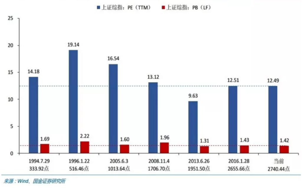 估值處于歷史第二底部:除上證A股外,其他板塊估值全面低于2014年低點,深證A股和中小板幾乎與2012年12月份的低點持平。對比上證綜指歷次歷史大底的市盈率和市凈率來看,當前估值僅略高于2013年1951點的時候,在7次歷史大底中位列倒數(shù)第二。