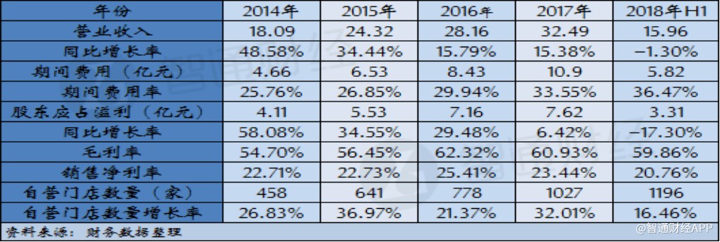 根據(jù)智通財(cái)經(jīng)APP的梳理,周黑鴨自營(yíng)門店數(shù)量在2014年為458家,此后三年公司自營(yíng)門店數(shù)量每年都有超過20%的增長(zhǎng),但期間公司營(yíng)業(yè)收入增幅卻呈現(xiàn)放緩的趨勢(shì)。與此同時(shí),公司門店數(shù)量的增長(zhǎng)也帶來費(fèi)用率逐年提升,截至2017年,公司期間費(fèi)用率達(dá)到33.55%,以至于公司凈利潤(rùn)增速同比下滑超過23個(gè)百分點(diǎn)。公司2018年中期財(cái)報(bào)顯示,上半年公司門店數(shù)量?jī)粼鲩L(zhǎng)169家,較2017年增長(zhǎng)16.46%,門店數(shù)量快速增長(zhǎng)的勢(shì)頭雖然的已延續(xù),但卻支撐不起公司營(yíng)收繼續(xù)保持增長(zhǎng),同時(shí)公司期間費(fèi)用率進(jìn)一步提升至36.47%,導(dǎo)致盈利水平大幅下滑。