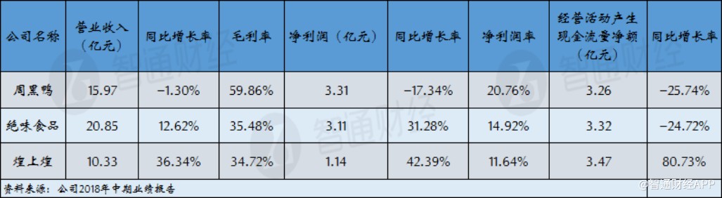智通財(cái)經(jīng)APP注意到,絕味食品(603517.SH)和煌上煌(002695.SZ)在今年中期均取得了不錯(cuò)的業(yè)績(jī)表現(xiàn)。其中,絕味食品在上半年實(shí)現(xiàn)收入20.85億元,同比增長(zhǎng)12.62%,凈利潤(rùn)3.11億元,同比增長(zhǎng)31.28%;煌上煌在上半年實(shí)現(xiàn)營(yíng)收10.33億元,同比增長(zhǎng)42.39%。此外,上述兩家公司的經(jīng)營(yíng)活動(dòng)產(chǎn)生的現(xiàn)金流量?jī)纛~分別為3.32億元和3.47億元,均超過周黑鴨的水平。也就是說,周黑鴨雖然紙面上盈利能力出眾,但衡量盈利質(zhì)量的經(jīng)營(yíng)活動(dòng)現(xiàn)金流方面,已經(jīng)沒有太多的優(yōu)勢(shì)。